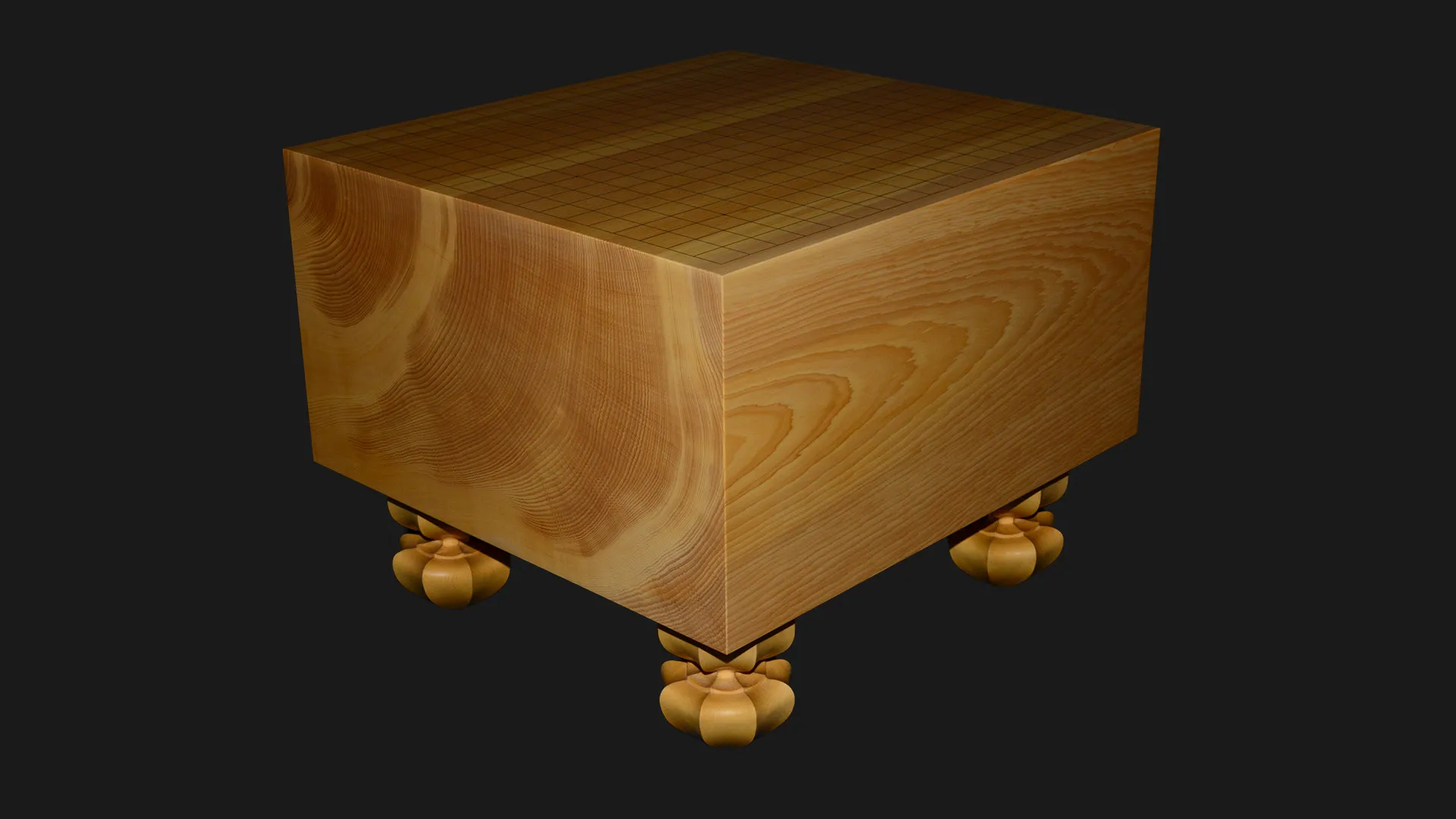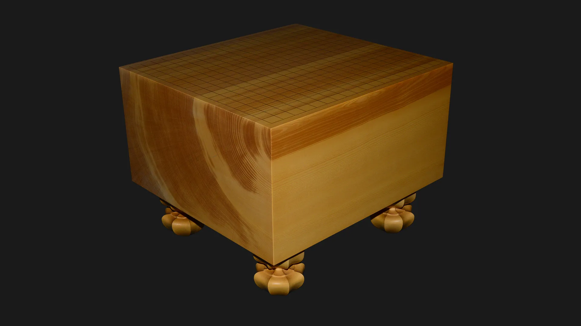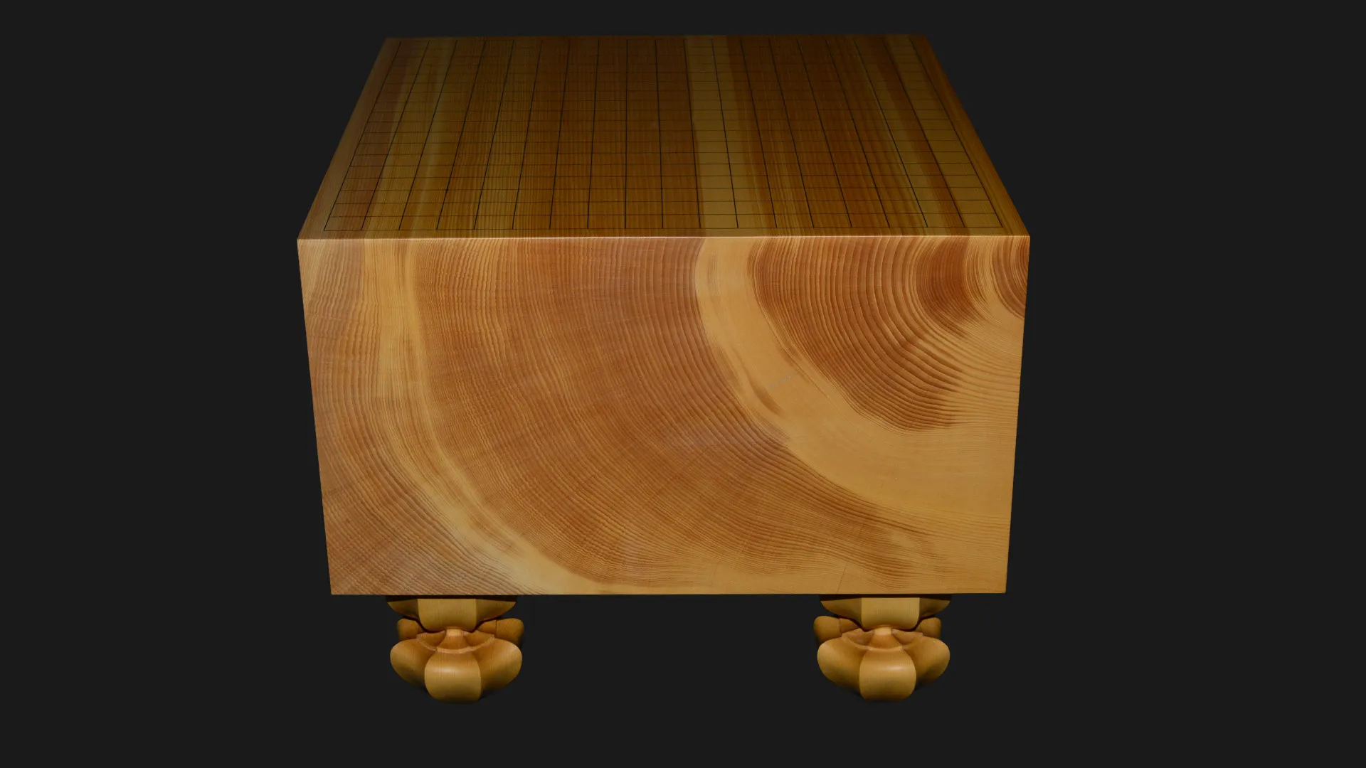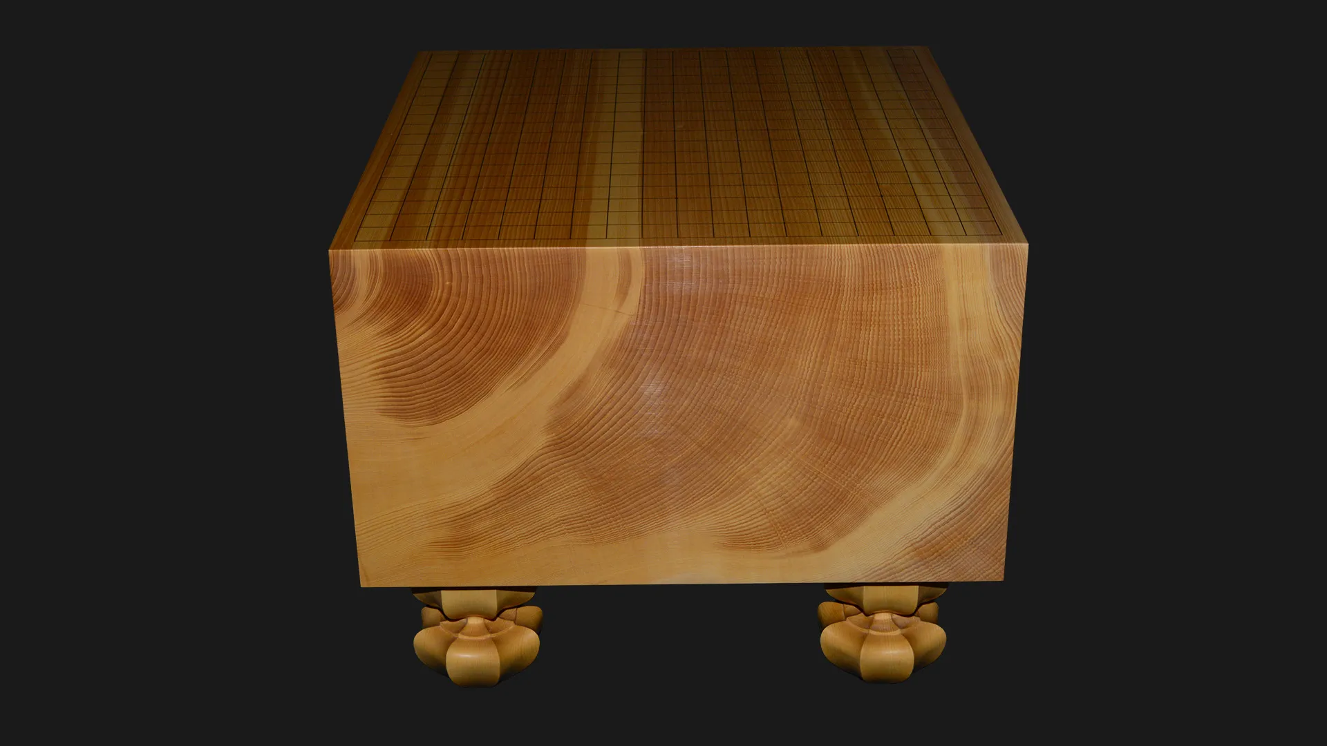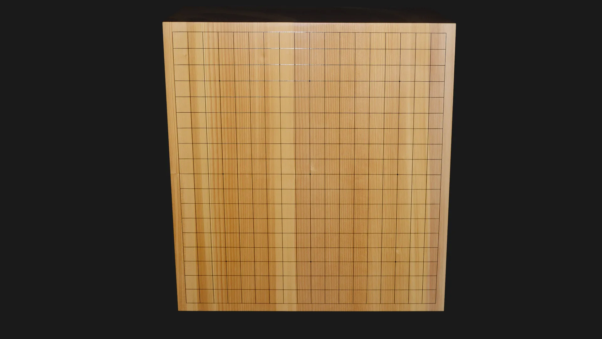 柾目取りで製作しています。柾目とは、丸太の中心に向かって切り出した断面で、縦に真っ直ぐ通った木目が現れます。この盤では、その線が盤面いっぱいに細かく均一に走っており、碁盤の格式を静かに体現しています。整然とした木目は視覚的な落ち着きをもたらすとともに、寸法の狂いが出にくいという点でも、長く使い続けるための構造的な誠実さがあります。