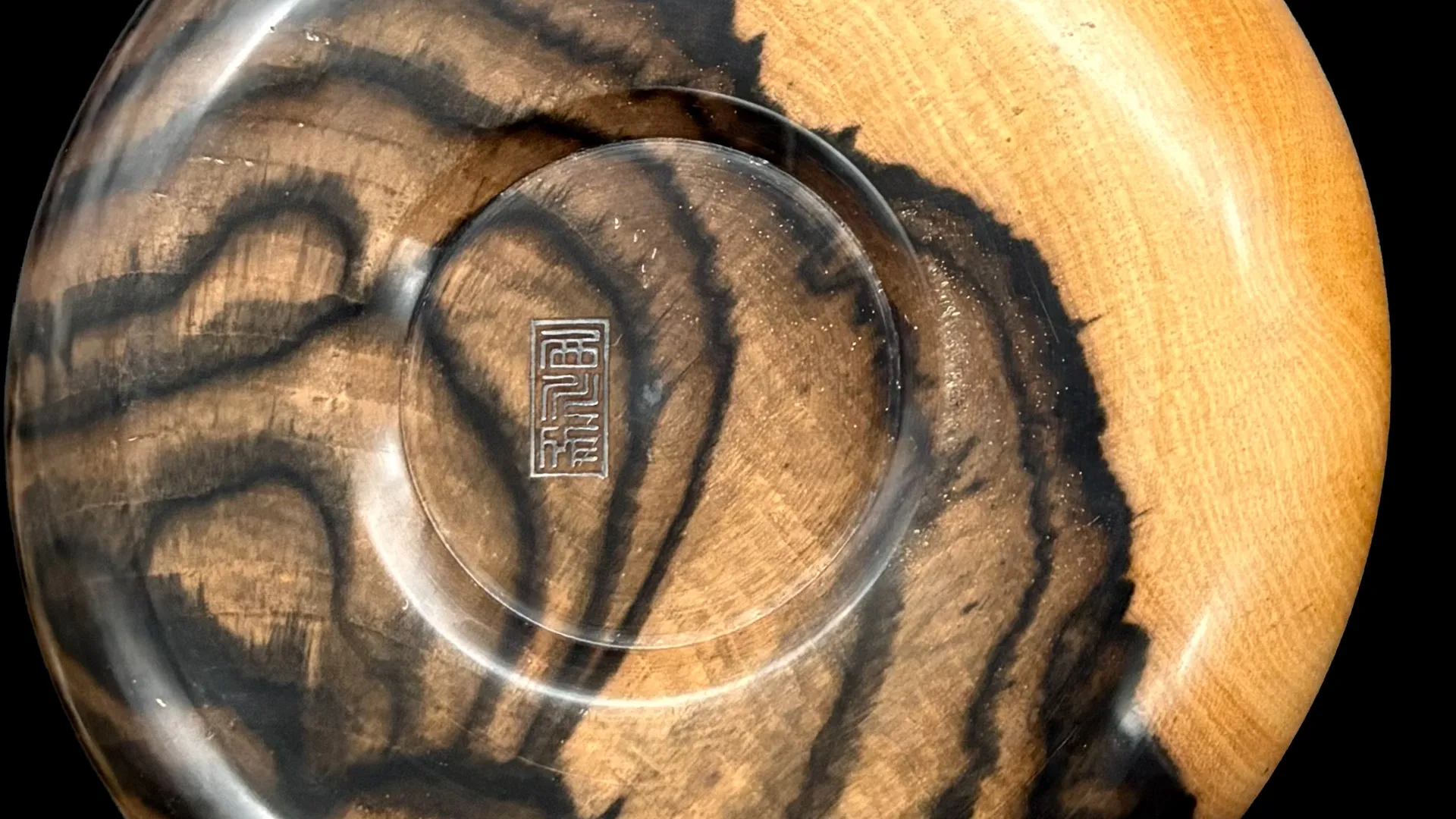 「黒柿」は、数百年以上の樹齢を重ねた柿の古木のうち、ごくまれに内部に黒い紋様が現れる素材です。その出現は数万本に一本とも言われており、木の外側からは判断できません。製材してはじめて、その表情が明らかになります。 白と黒のコントラスト、筆で描いたような流れる紋様——それは自然がつくり出した、二つとない一点の造形です。